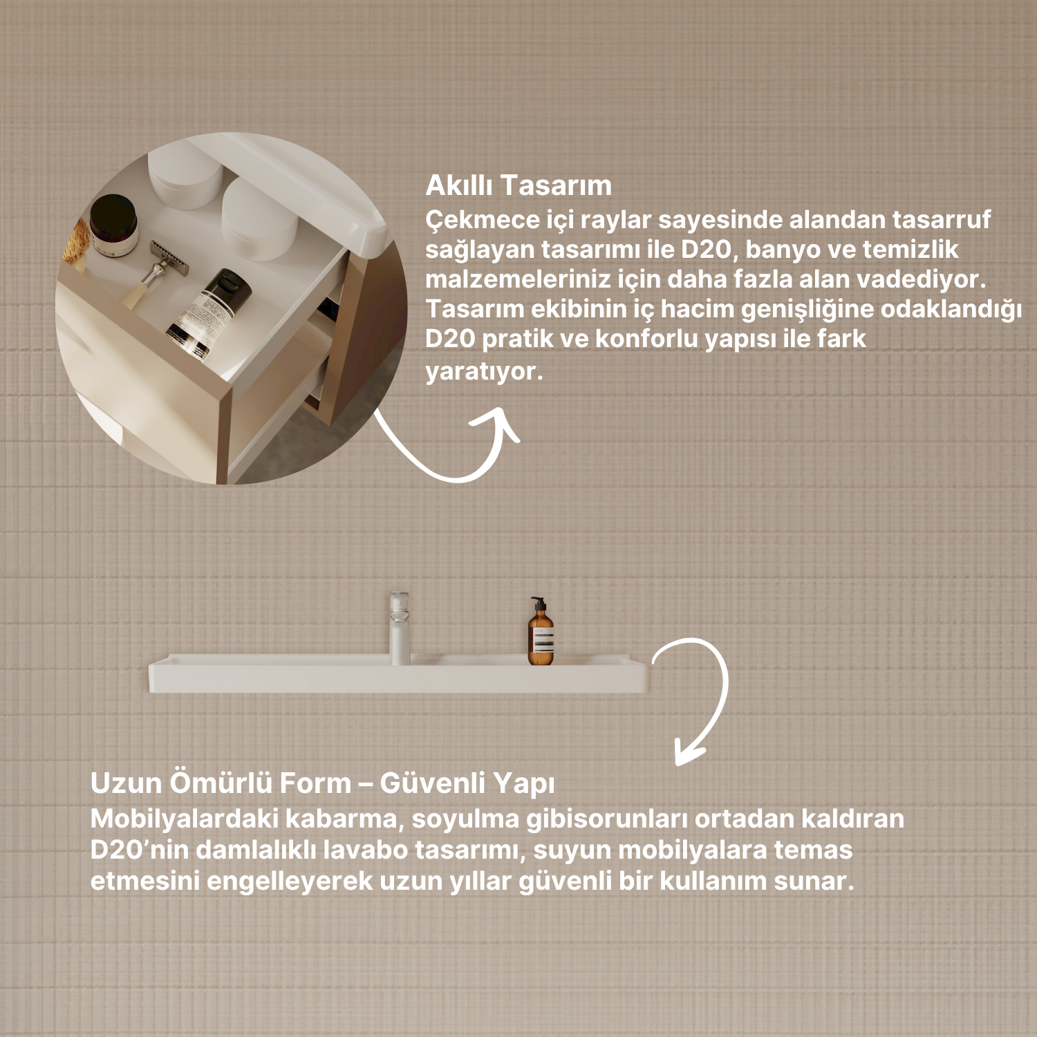 D20 setleri farklı renk ve boyut seçenekleri ile banyolara özgürlük sunuyor. Yalın ve derinlikli tasarım dili ile banyoda ferah bir atmosfer yaratan D20, geniş saklama alanlarıyla daha düzenli bir mekan kurgusu vadediyor