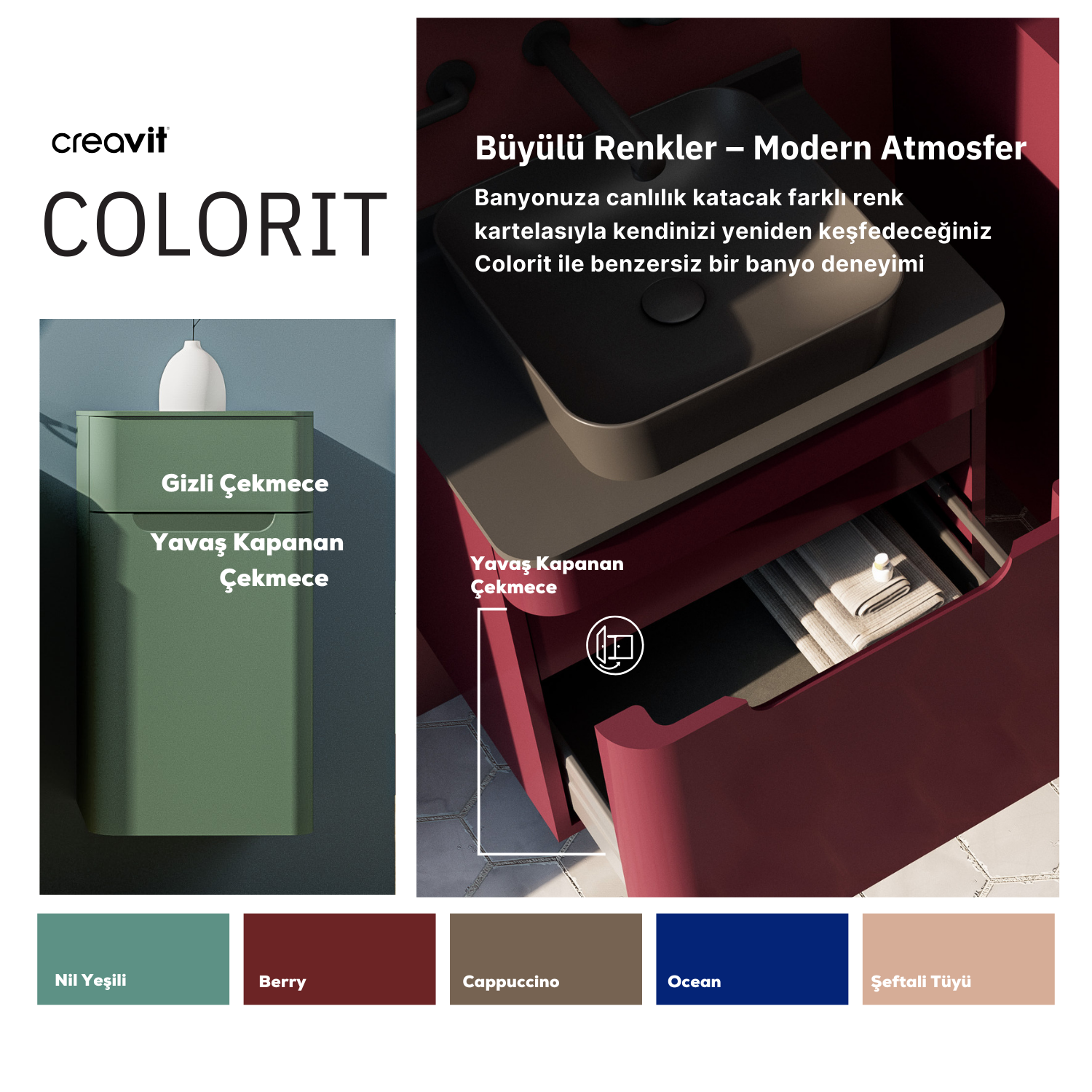 Elegant bir banyo deneyimi sunan Colorit; solid tezgâh ve lake kaplama yapısı ile uzun yıllar rahatlıkla kullanabileceğiniz sağlamlıkta yaratıldı. Colorit farklı lavabo seçenekleri, ideal ölçüdeki saklama alanları ile kusursuz bir mekan kurgusu kişisel banyo deneyimi için yaratıldı.