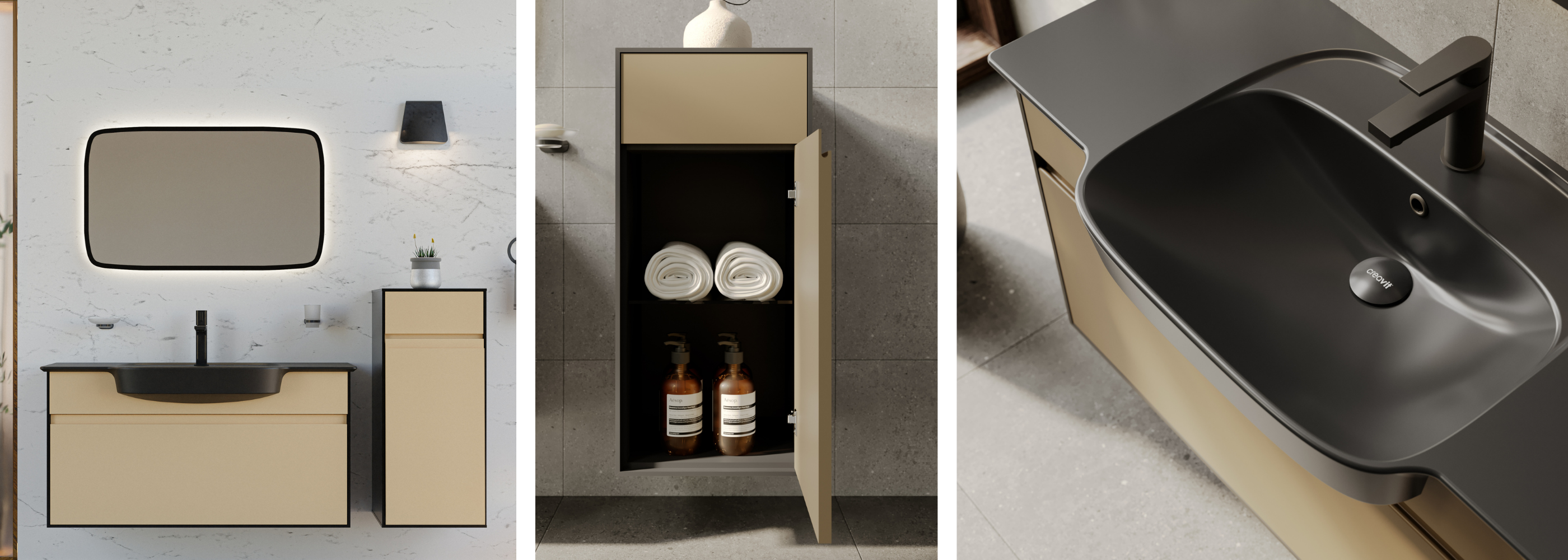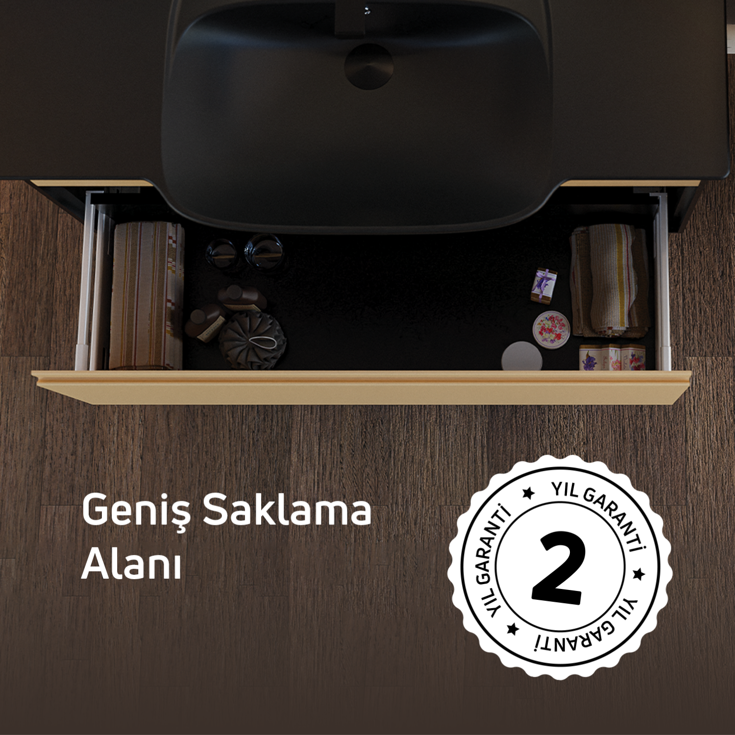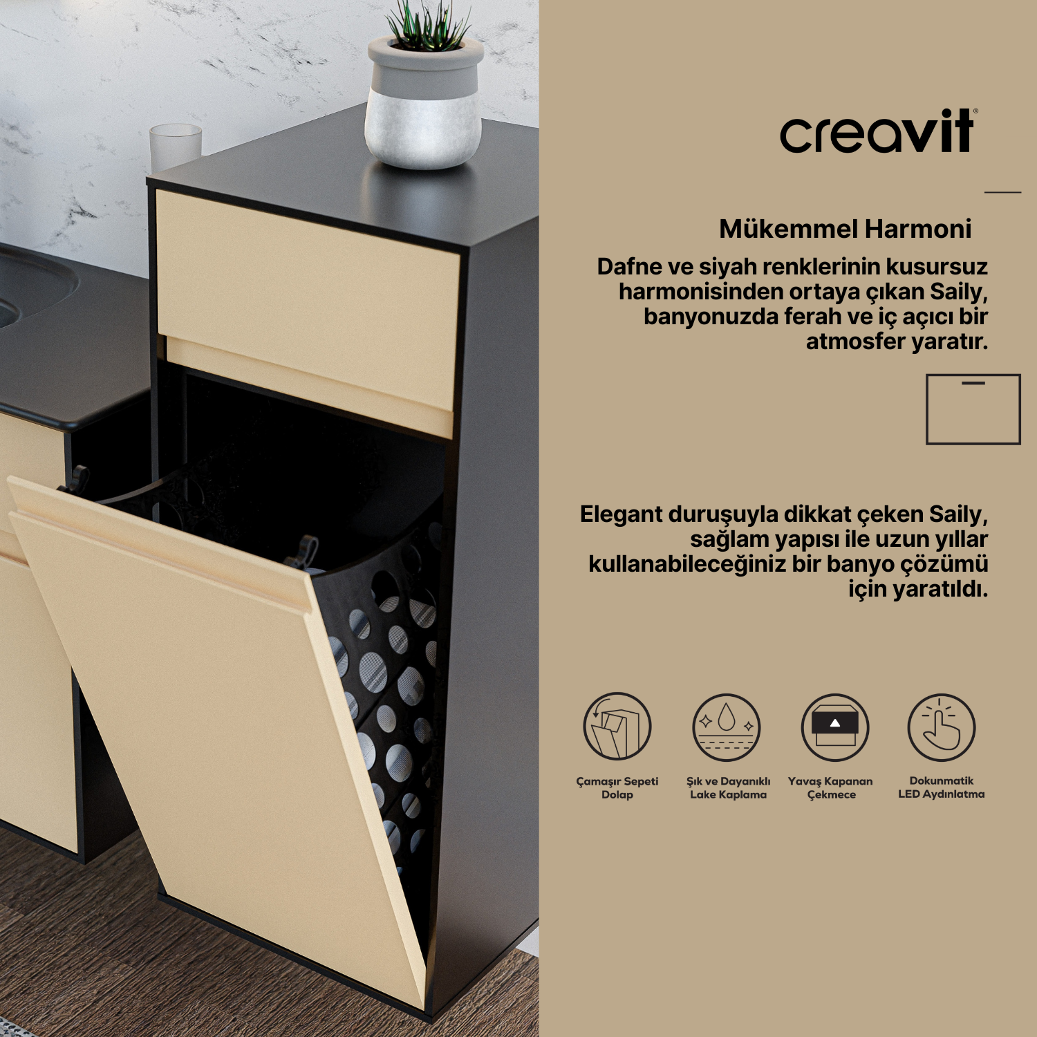 Banyo içinde ihtiyacınız olan tüm ürünleri depolayabileceğiniz Saily, 100 cm çekmeceli dolabı, kısa çamaşır sepeti, dolap üzeri çekmecesi ile banyo düzeninize bütüncül ve kesin bir çözüm sunuyor.